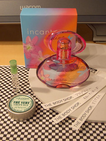 写真左下はロクシタンの練り香水「グリーンティー」。酸っぱさが爽快。